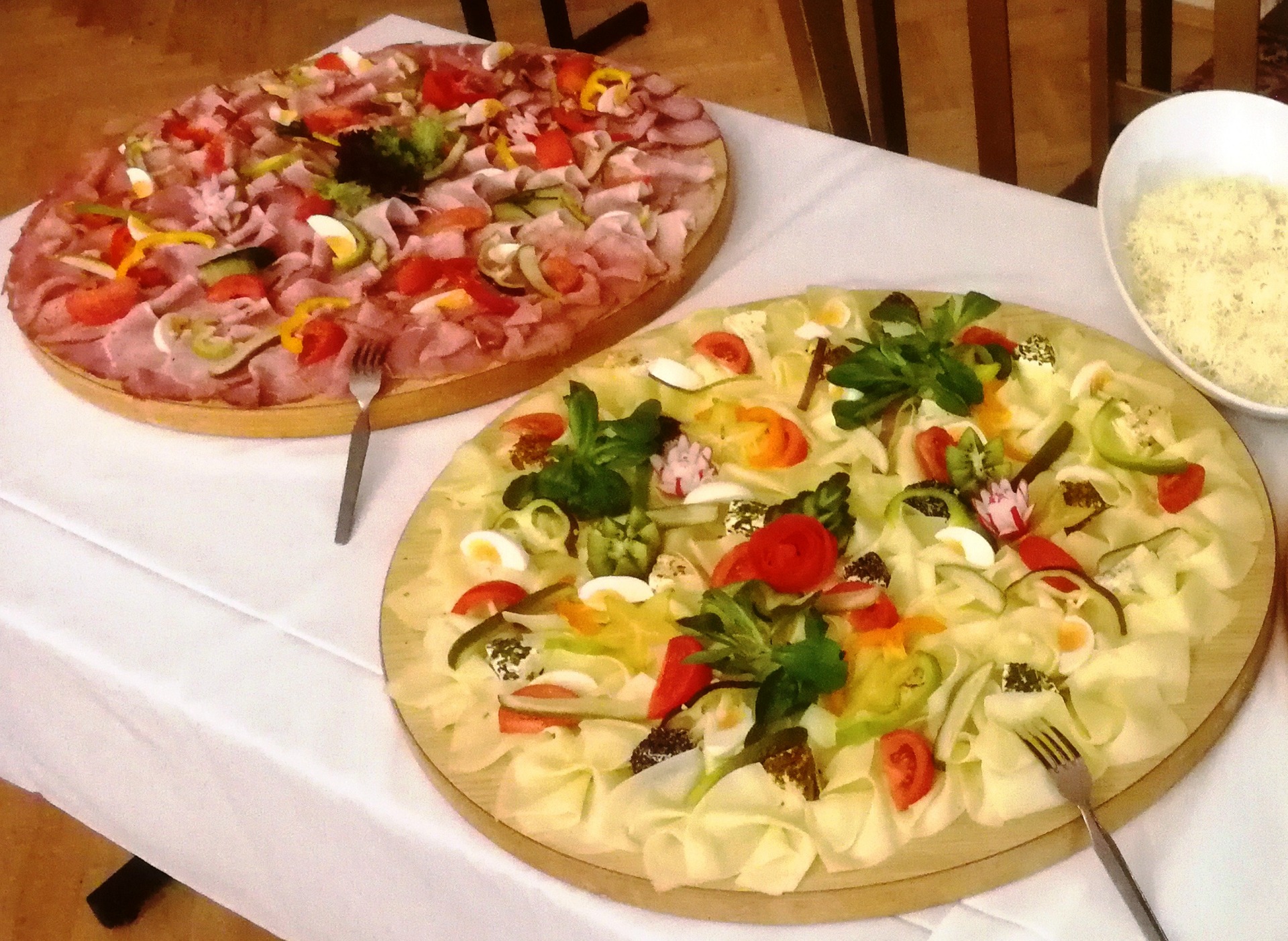 - Käse, Salat (Lumpen-, Rindfleisch- oder Schafskäsesalat), Aufstriche, Brot und Garnierung